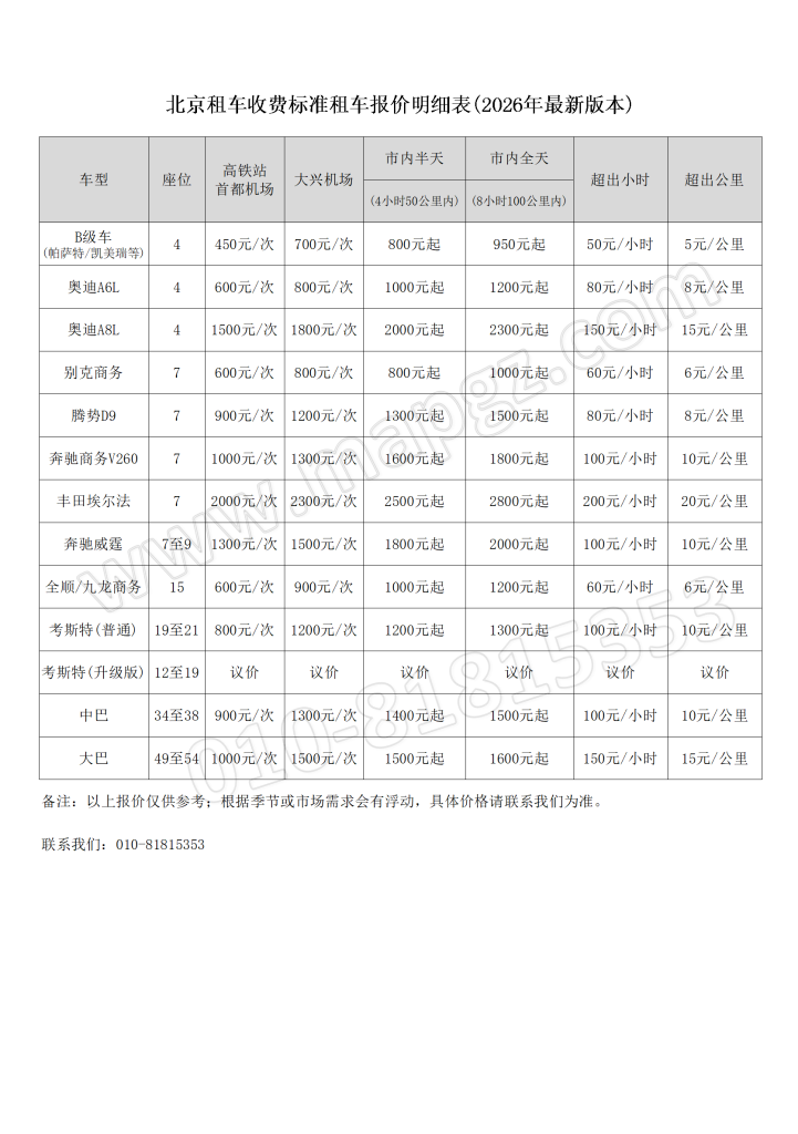 | 機(jī)場單程接送 | 1000-1500元/次 | 50公里 | 首都機(jī)場、大興機(jī)場接送 |