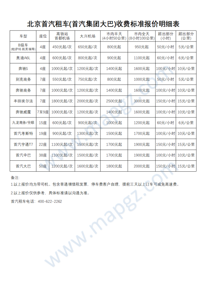 ]]>| 車(chē)型 | 座位 | 高鐵站 首都機(jī)場(chǎng) | 大興機(jī)場(chǎng) | 市內(nèi)半天 (4小時(shí)50公里內(nèi)) | 市內(nèi)全天(8小時(shí)100公里內(nèi)) | 超出小時(shí) | 超出公里 |